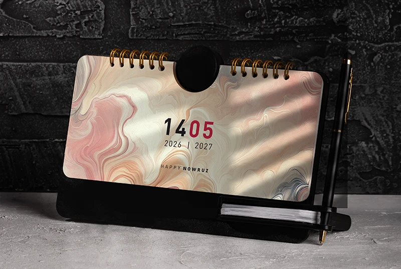 تقویم رومیزی طرح ماکان محصولی است که با الهام از خطوط هندسی مدرن و الگوهای کلاسیک طراحی شده. نام “ماکان” به معنای “جاودان”، حس پایداری و ماندگاری را القا میکند – ویژگیای که در مواد ساخت آن هم مشهود است. این تقویم برای سال ۱۴۰۵ شامل تقویم شمسی دقیق، با ذکر مناسبتهای ملی، مذهبی و فضایی برای یادداشتهای شخصی است. صفحات آن با پوشش جلد محافظ، از آسیبهای روزمره در امان میمانند و ظاهری حرفهای به میز کار میبخشند.